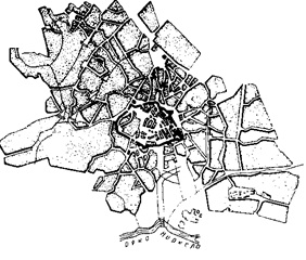 Первоначальное ядро городов обычно было очень компактным: многоугольные очертания укреплений повторялись направлением улиц, расположенных внутри цитадели. Такова была наиболее древняя часть города Ахтырки5. Следует заметить, что в планировке этого города, как и в некоторых других, заметно влияние европейской школы фортификационного искусства6. Это проявилось в геометрически правильных очертаниях крепостей и в том, что углы укреплений вынесены вперед с таким расчетом, чтобы обеспечить прямой и фланговый огонь. Компактная планировка первоначального ядра Ахтырки характерна для городов равнинной местности.
