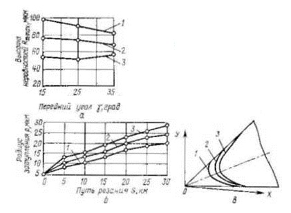 Pис 2 Влияние переднего угла γ на показатели процесса α .. высоту неровностей Rm mах при фрезе ровании инструментом с различным радиусом затупления, 1 — р = 25 нкм, 2 — р = 15 мкм 3 — р — б мкм б — износ инструмента
