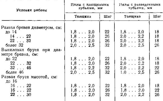 Уширение зубьев рамных пил на одну сторону при обработке хвойной древесины влажностью до 30 % должно быть 0,6… 0,7 мм, влажностью больше 30% —зимой 0,6 … 0,7 мм, летом 0,7 … 0,8 мм, при обработке твердых лиственных пород — 0,45 … 0,60 мм [7].