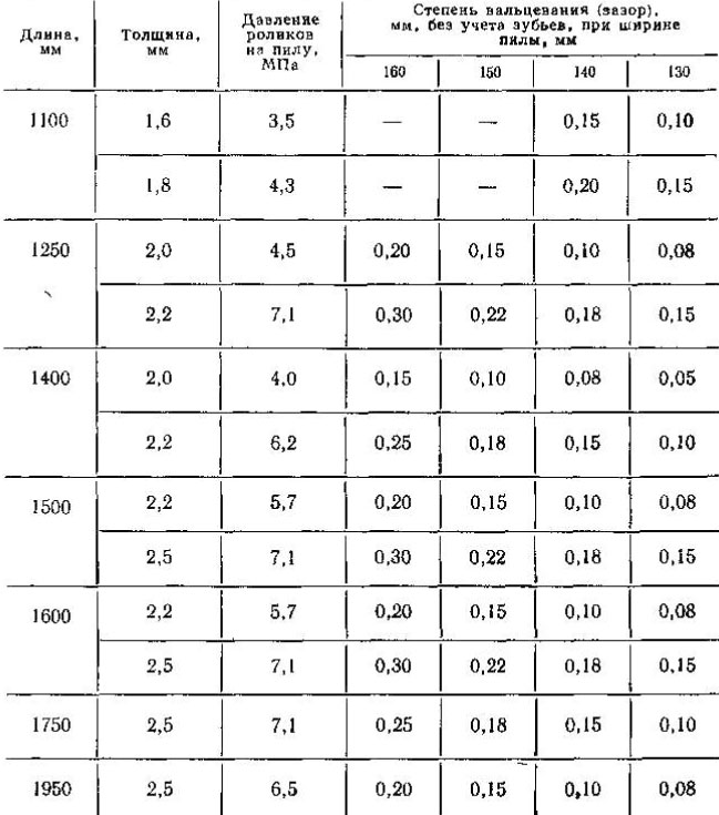 Максимальное давление роликов вальцовочного станка в зависимости от длины и толщины пилы, по данным ЦНИИМОДа, приведено в табл. 13.