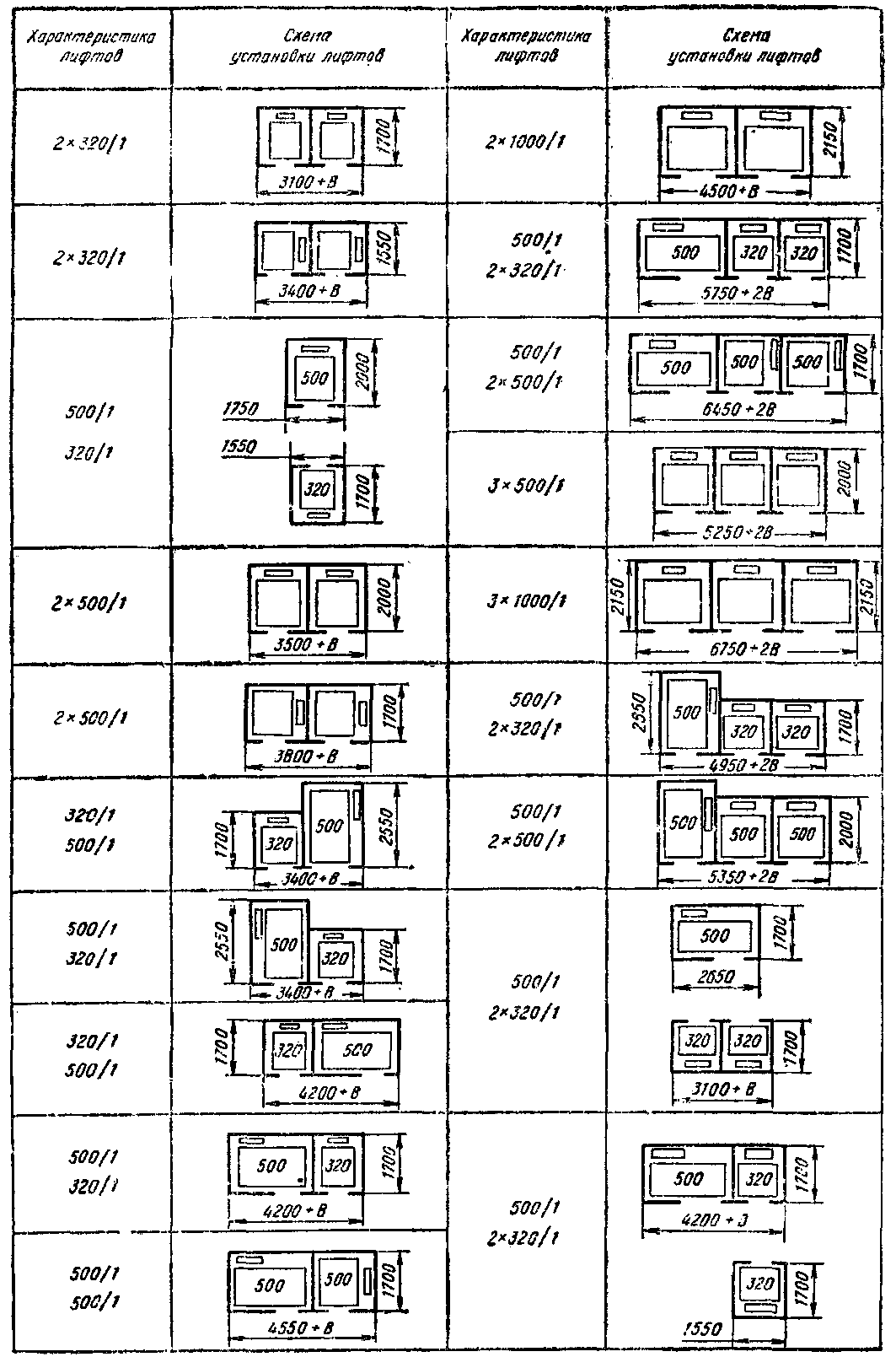 Устройство металлокаркасных шахт с ограждением их металлической сеткой допускается только при невозможности устройства глухих шахт; это устройство в каждом случае должно быть согласовано с головной проектной организацией по проектированию лифтов. Размеры проемов в строительных конструкциях для установки металлокаркасной шахты должны быть на 100 мм больше ее наружных размеров с учетом выступающих частей ограждения этой шахты. Внутренние размеры (в плане) металлокаркасной шахты должны быть равны внутренним размерам (в плане) глухой шахты у всех лифтов, а у больничных больше по ширине на 50 мм. При установке двух и более лифтов в одной общей шахте ширина такой шахты должна быть равна суммарной ширине шахт устанавливаемых в ней лифтов, увеличенной на ширину балок, укладываемых между лифтами и предназначенных для крепления направляющих, но не более 100 мм для каждой балки. Планы шахт, машинных и блочных помещений могут представлять собой зеркальное отражение планов, приведенных на рисунках.
